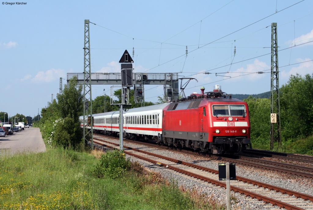 120 146-6 mit dem IC 2362 Stuttgart-Bruchsal-Karlsruhe an der südlichen Signalbrücke des Bahnhofs Weingarten. Das Gleis ganz vorne ist das Überholgleis, das im Sommer 2012 komplett saniert wurde. Aufgenommen in Weingarten (Baden) beim Bahnübergang Dörnigstraße am 11.06.2013. Gregor Kaercher