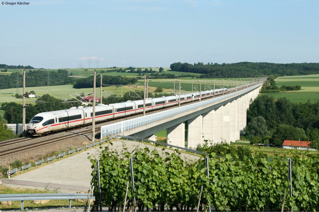 Eine unbekannte Baureihe 401 überquert als ICE 1090 (München-Berlin Südkreuz) die Talbrücke Enzweihingen und wird gleich darauf im Marksteintunnel verschwinden. Aufgenommen am 01.07.2013. Gregor Kaercher