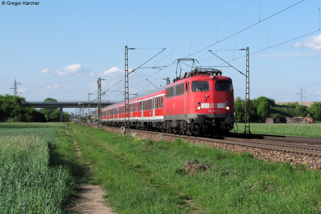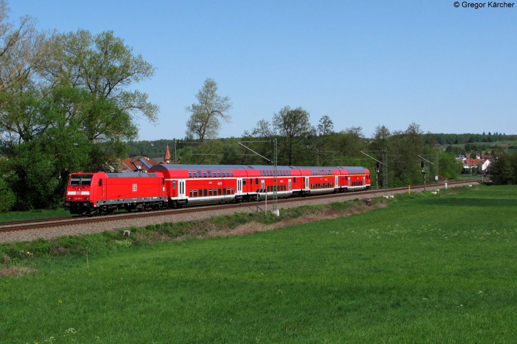 Geschoben von 146 221-7 legt sich der RE 19506 (Stuttgart-Heidelberg) bei Ölbronn in die Kurve. Sein nächster Halt wird in zirka 10 Minuten Bretten sein. Aufgenommen am 01.05.2012.