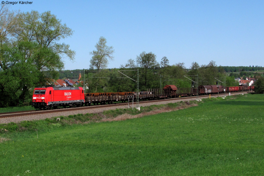 Als der kräftige Schauer abgezogen war, marschierten ich und Hannes zu der berühmten Fotostelle in Denzlingen. Unser erstes Motiv war dort ein ICE-Ersatzzug für den ICE 375 (Berlin-Interlaken). Dieser Ersatzzug verkehrte allerdings nur bis Basel SBB Schublok ist 120 152-4. Aufgenommen am 21.04.2012.