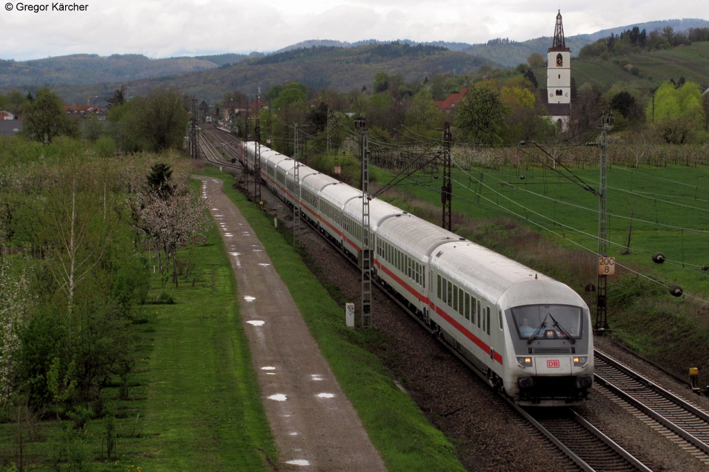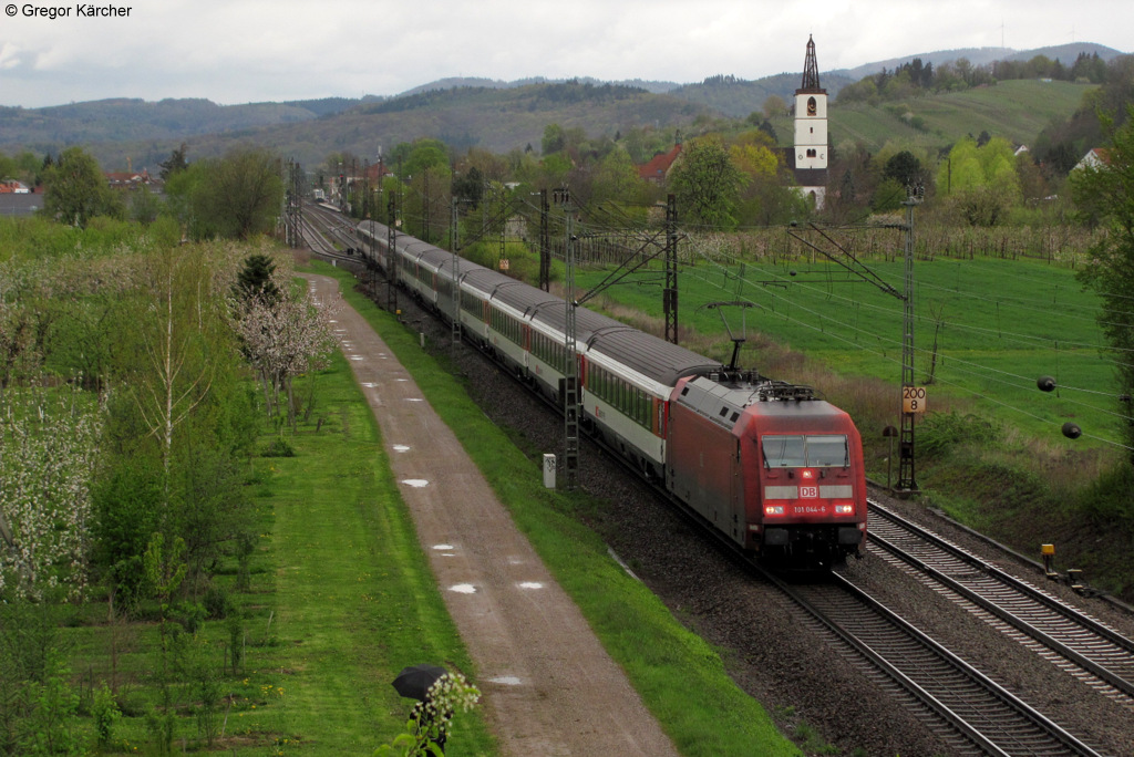 Die 101 044-6 mit dem EC 101 Hamburg-Chur bei Denzlingen. Aufgenommen am 21.04.2012. Unten hinter dem Ast verdeckt fotografiert Hannes Müller den Zug.