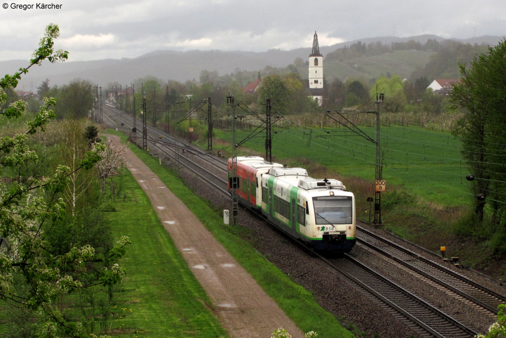 VT 006 bzw. 650 033-3 (95 80 0650 033-3 D-BSB) hält zusammen mit 650 045-7 (95 80 0650 045-7 D-BSB) als BSB 88461 (Waldkirch-Freiburg Hbf) in Denzlingen. Aufgenommen am 21.04.2012. Es wurde nach diesem Bild immer grauer, denn es zog ein kräftiger Regenschauer auf.