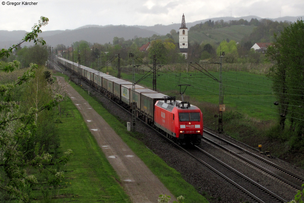 Weil das Wetter am Nachmittag immer schlechter wurde, entschlossen wir (Ich und Hannes) unsere gemeinsame Tour zu beenden und früher nach Hause zu gehen. Das letzte Motiv unserer gemeinsamen Tour war die 145 067-5 bei strömendem Regen mit dem  Ambrogio Intermodal Only  nach Gallarate (Italien). Denzlingen, 21.04.2012.