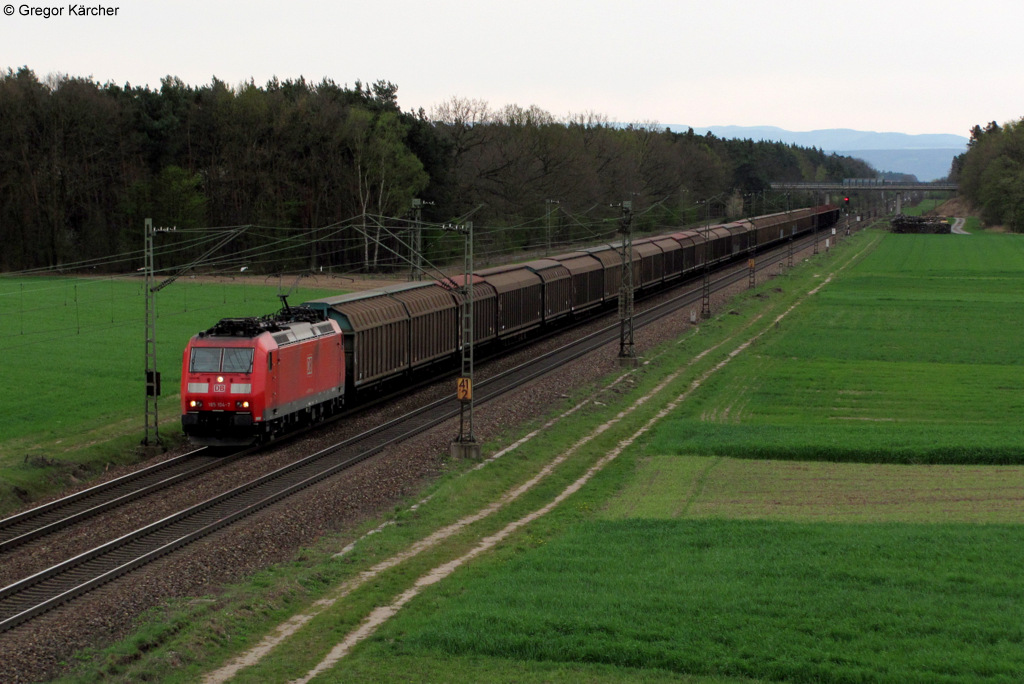 Ortswechsel von Ringsheim nach Denzlingen während unserer gemeinsamen (ich und Hannes Müller) Tour. Während rechts die BSB nach Waldkirch am Außengleis 5 hält, passiert die 185 068-4 mit einem Containerzug den Bahnhof Denzlingen. Aufgenommen am 21.04.2012. Gregor Kaercher