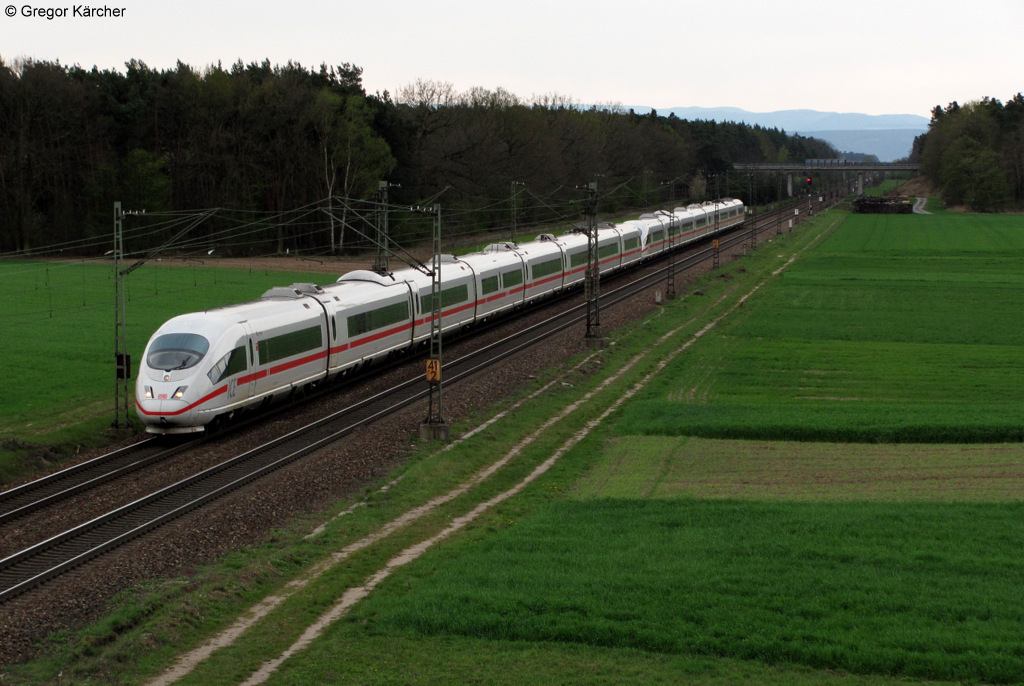 Nur wenige Sekunden, nachdem der Güterzug auf dem Gegengleis durchgefahren war, war er schon da. Der ICE 501 von Köln nach Basel SBB. Gefahren wurde die Leistung von 403 002-9 "Hansestadt Lübeck" und 403 003-7 "Dortmund". Im Hintergrund ist auch hier Hannes Müller zu sehen. Aufgenommen am 21.04.2012. Gregor Kaercher