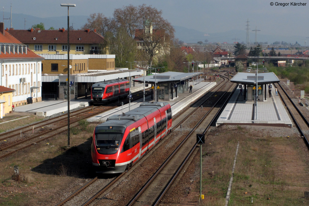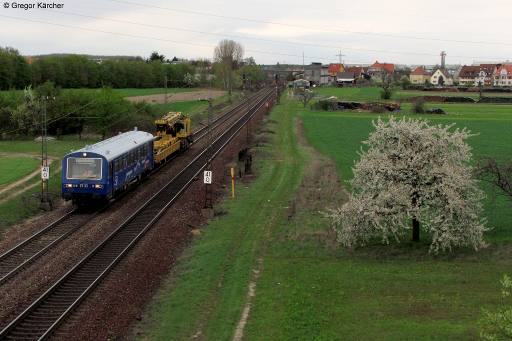 TW 851 und TW 8** erreichen am 15.04.2012 als S4 Eilzug nach Karlsruhe Albtalbahnhof den Haltepunkt Wössingen Ost. Das Bild entstand legal vom Zugangsweg zum Haltepunkt. Gregor Kaercher
