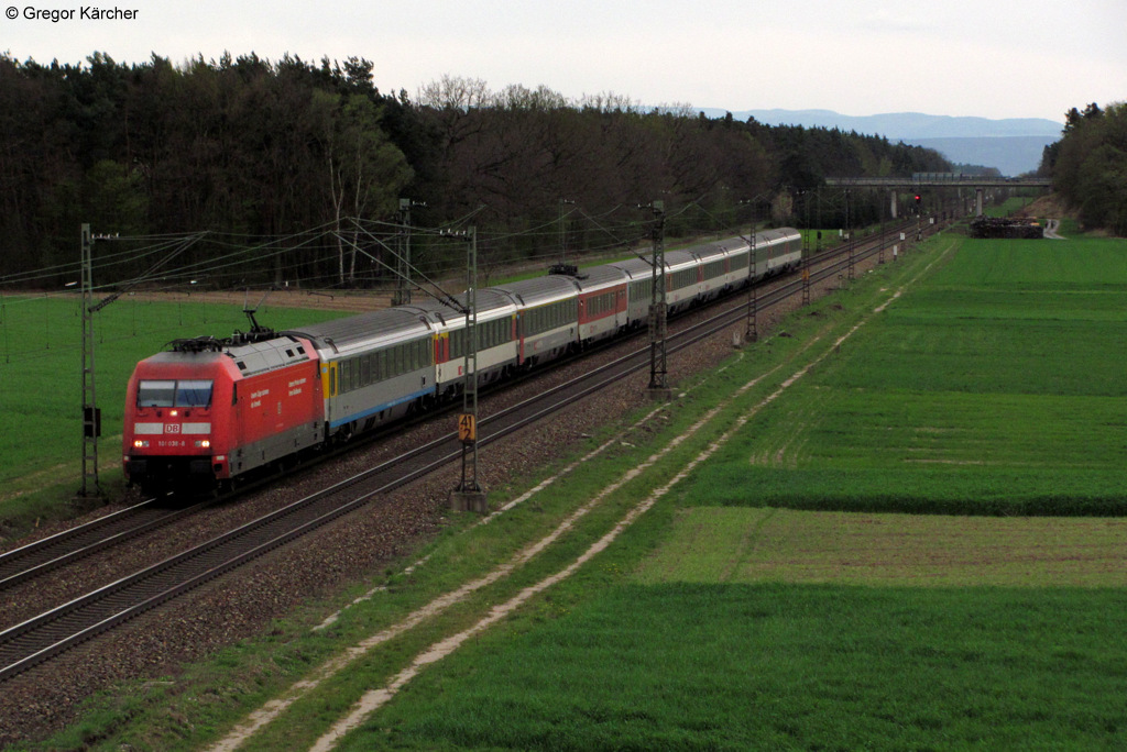 Etwa seit Anfang April wieder auf 101 umgestellt ist das EC Zugspaar 6/7. Hier die 101 038-8 mit dem EC 6 Chur-Hamburg am 10.04.2012 bei Graben-Neudorf. Gregor Kaercher