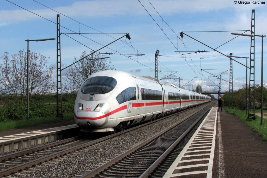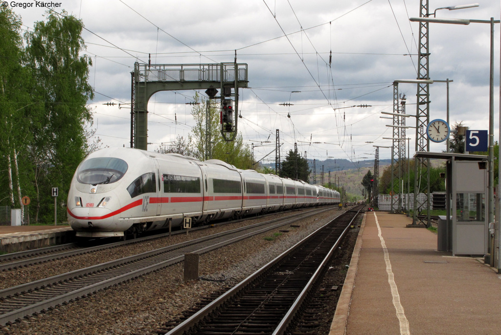 Weniger als eine Minute nach der Durchfahrt eines Güterzuges passieren 403 057-3 und 403 014-4 "Duisburg" als ICE 503 (Hannover-Basel über Köln) den Bahnhof Denzlingen. Aufgenommen am 21.04.2012. Gregor Kaercher