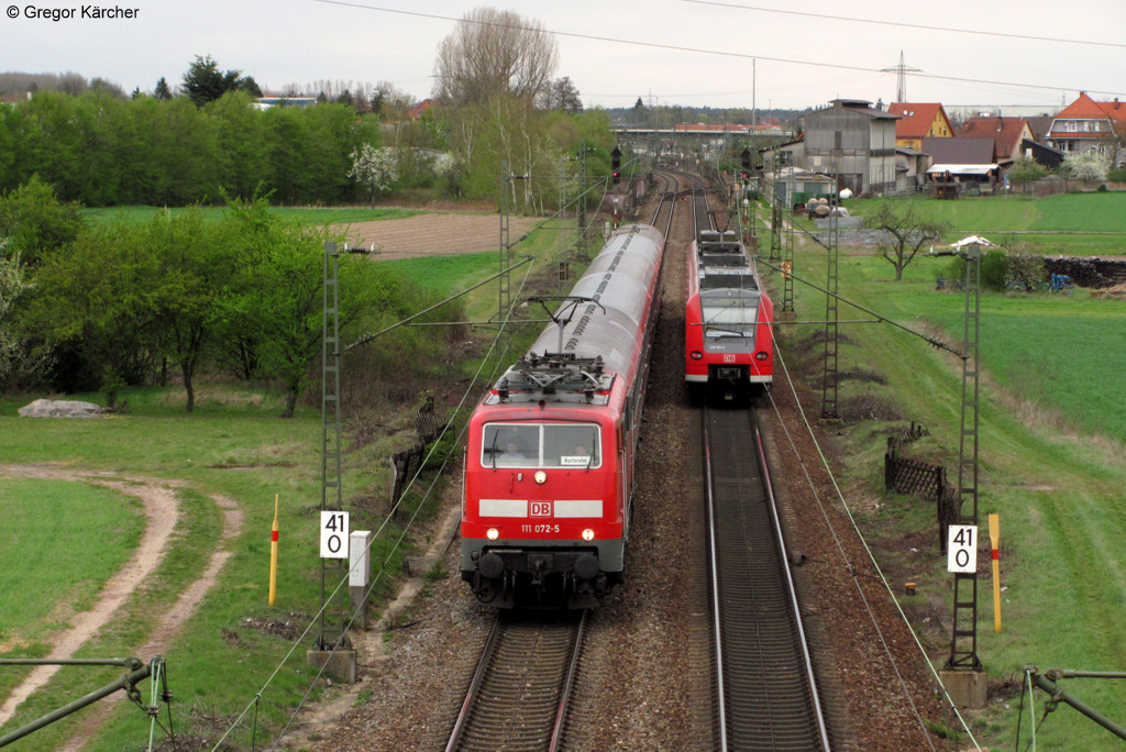Während die 111 072-5 mit der RB 38855 (Manhheim-Karlsruhe) den Bahnhof Graben-Neudorf soeben verlassen hat, muss der ET 425 als RE 3862 (Karlsruhe-Mainz) noch auf die Einfahrt in Graben-Neudorf warten. Aufgenommen am 10.04.2012. Gregor Kaercher