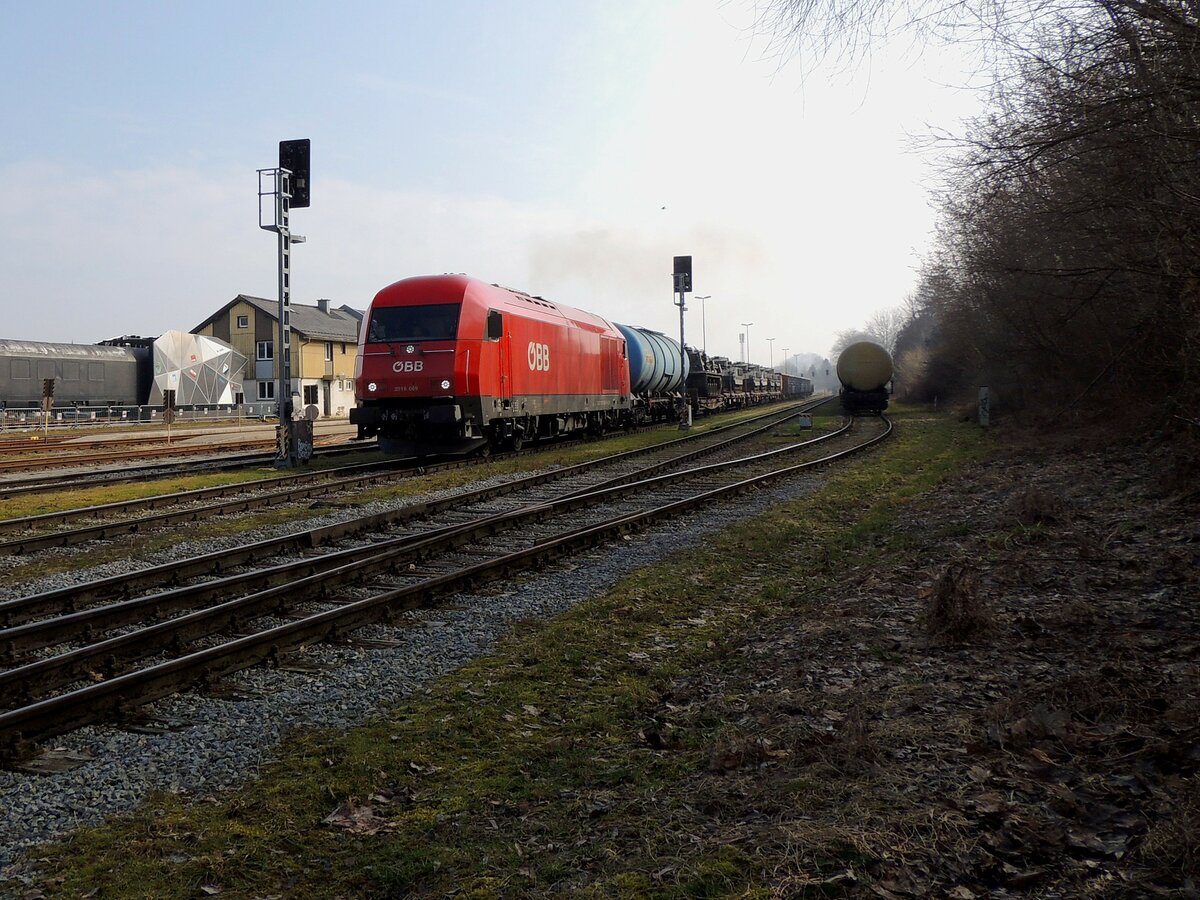 2016 069-4 muß sich bei der Ausfahrt aus dem Bhf. Ried mit ihrem Verschubgüterzug, welcher u.a. mit militärischer Gerätschaft beladen ist, sozusagen schon etwas ins Zeug hängen; 230303
