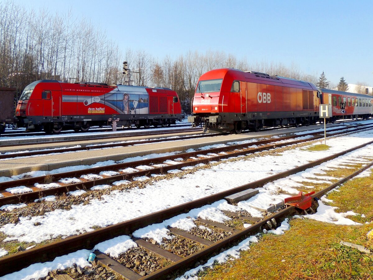 Kopf an Kopf, bzw. Puffer an Puffer: 2016 071-7 trifft mit R5965 im Bhf. Ried auf 2016 910-9 welche mit Güterzug auf die Abfahrt wartet; 230210