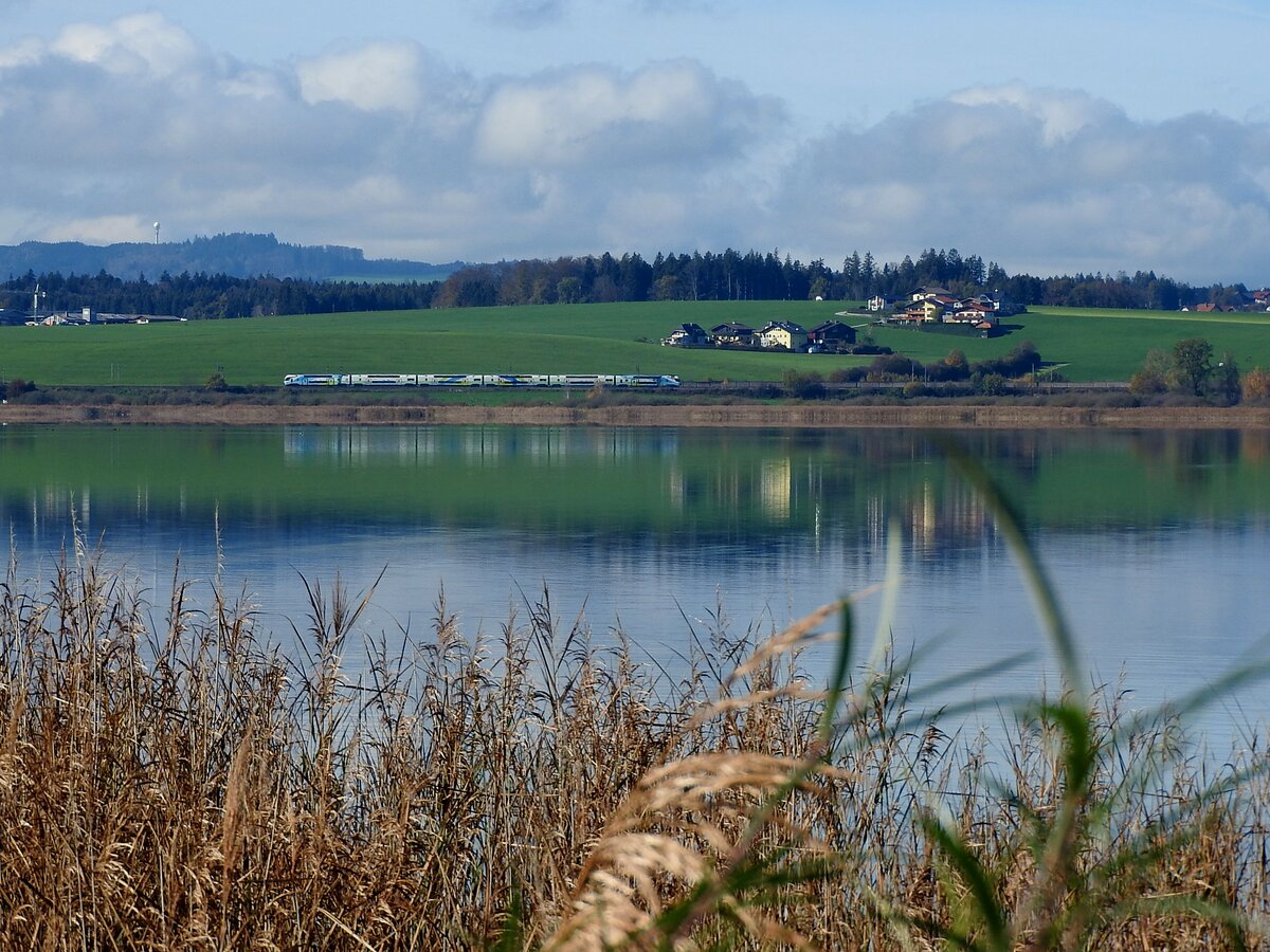 Westbahngarnitur  WEST915  konnte entlang des Wallersees bei seiner Fahrt in Richtung Linz, kurz vor dem Bhf. Neumarkt-Köstendorf erspäht werden, im Hintergrund ist die Flug-Radarüberwachung Haunsberg ersichtlich; 221113