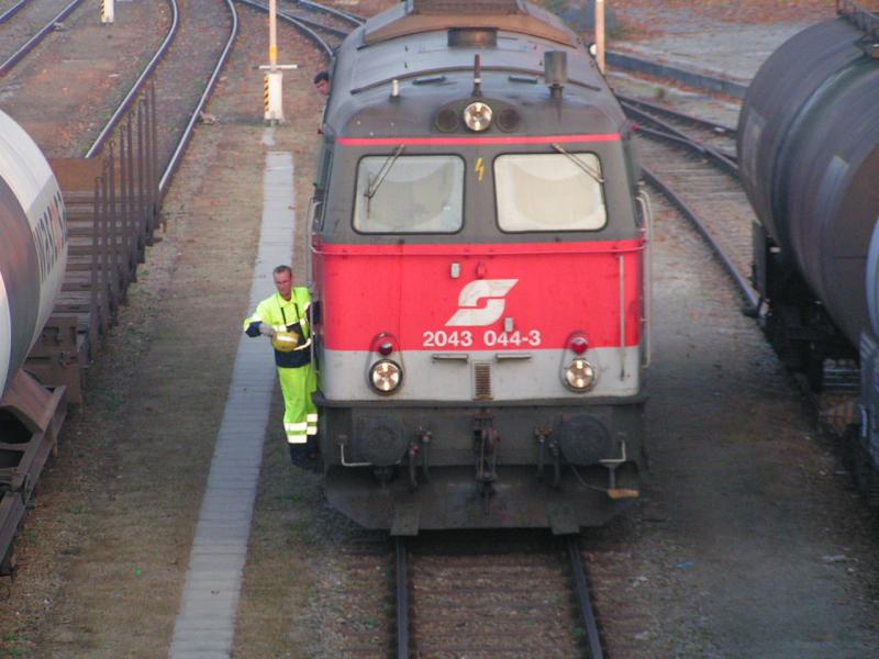 2043 044-3 mit "helmwinkenden" Verschieber am Weg zu "ihrem" Rohölzug (6 Wagen/ 24Ax) Bhf. RIED i.I. 2005-10-31