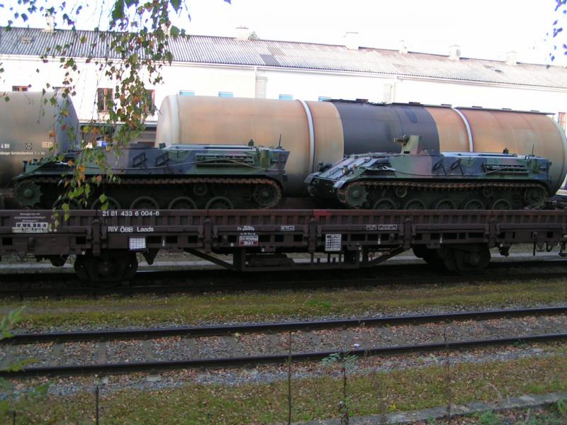 Laads (ÖBB) mit 2 SAURER-Schützenpanzer Bhf. RIED i.I. 2005-10-19
