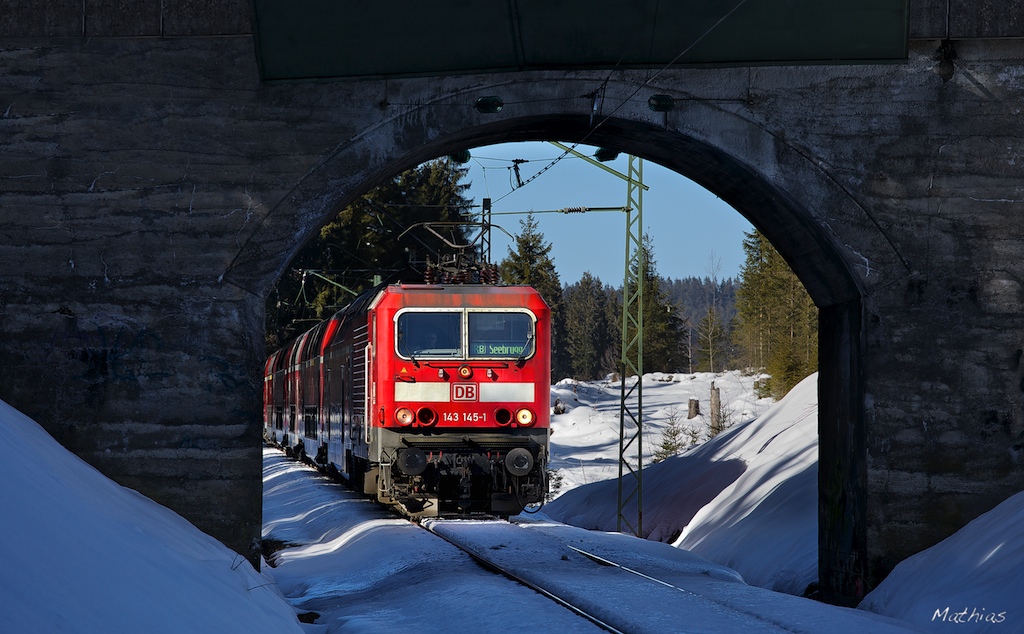 Nochmals zur Dreiseenbahn (KBS 728). Am 3. März 2013 lag immer noch Schnee, hier bei Aha. Auf dem Foto ist 143 145 mit ihrem RB von Freiburg nach Seebrugg zu sehen. Diese Stelle war etwas schwierig umzusetzen, da den ganzen Tag keine Sonne dort hinkommt. Wie man an den Schatten erkennen kann, war nur ein halber Meter Sonne für die Front der Lok. Mathias D.