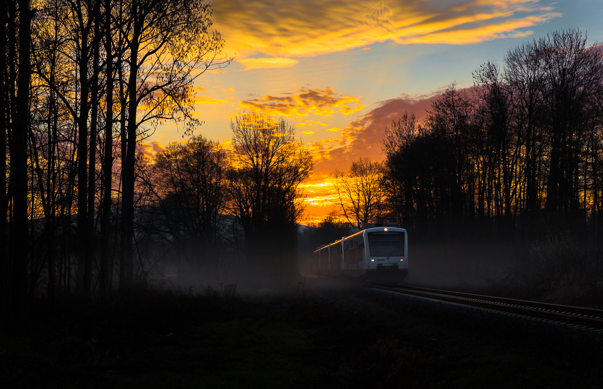 Mit der Morgenröte ist es immer so eine Sache: Gibt es eine, wann ist sie, fährt überhaupt ein Zug... Nachdem mehrere Tage beobachtet wurde, ob über dem Schwarzwald ein Paar lockere Wolken stehen, war es am Morgen des 18.März.2014 endlich so weit.