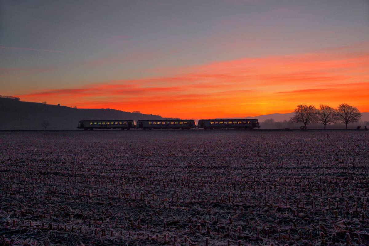 Doch vorgenommen ist vorgenommen und so steht man auf einmal bei völliger Dunkelheit in den Feldern von Breisach. Einige Minuten später und gute 45 Minuten vor Sonnenaufgang durchbricht die Morgenröte über dem Schwarzwald die Dunkelheit und das morgendliche NE81 Trio der SWEG die Stille...