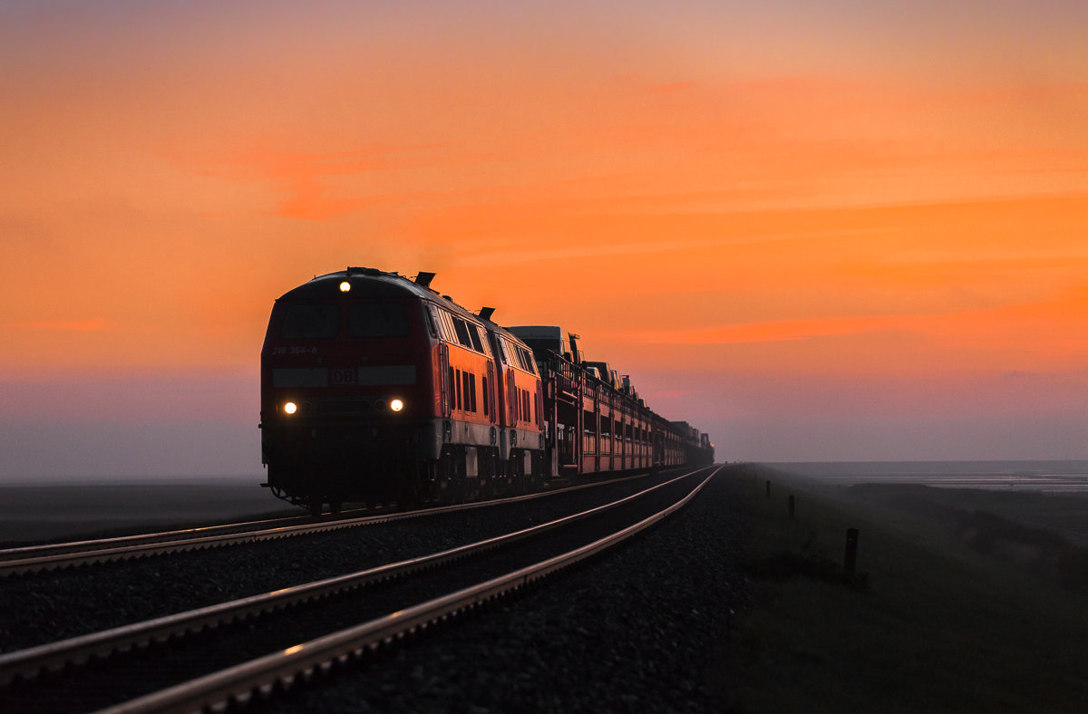 Solch orange Wolken habe ich selbst so gut wie nie gesehen. Wir stehen gerade am Hindenburgdamm bei Morsum, als 218 379- 6, geneinsam mit den ersten Sonnenstrahlen des Tages, die Stille durchbricht. (6.9.15)