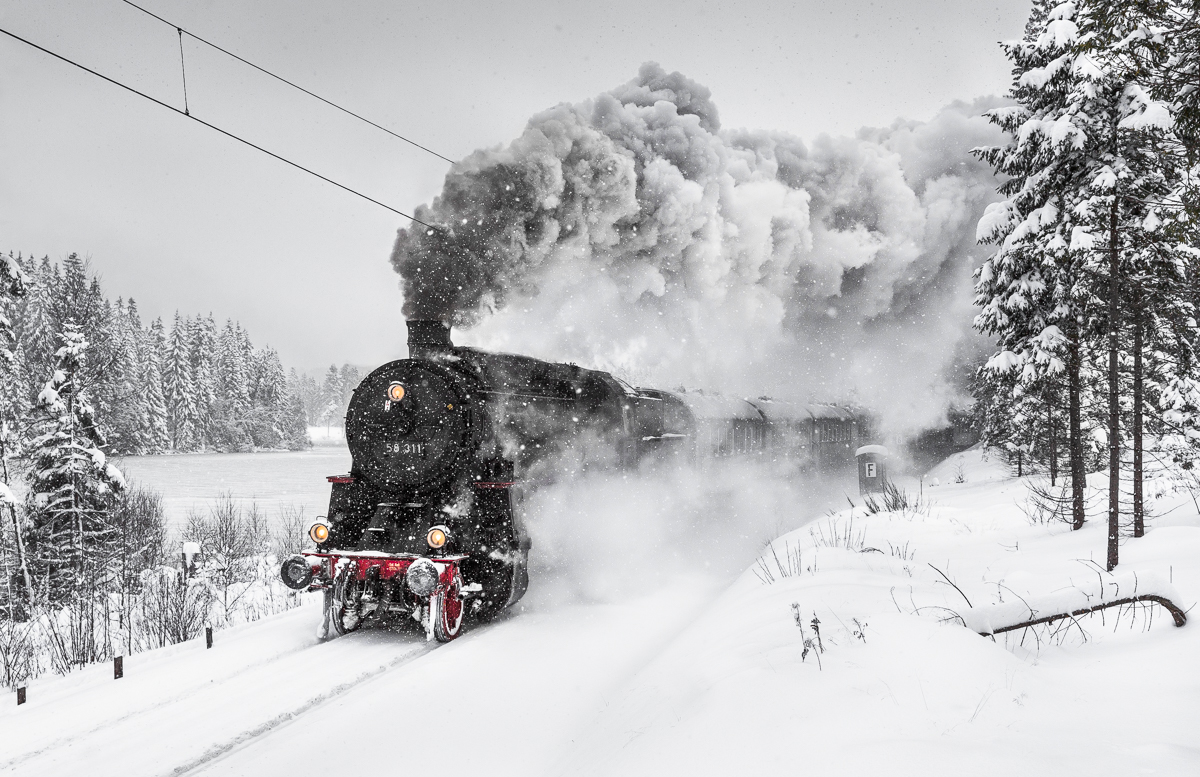Endlich zum Objekt der Begierde: Mit heftigen Schleudern, donnerte 58 311 der UEF (Danke!) mit dem Zug von Titisee nach Seebrugg am zugefrorenen Windgfällweiher vorbei.