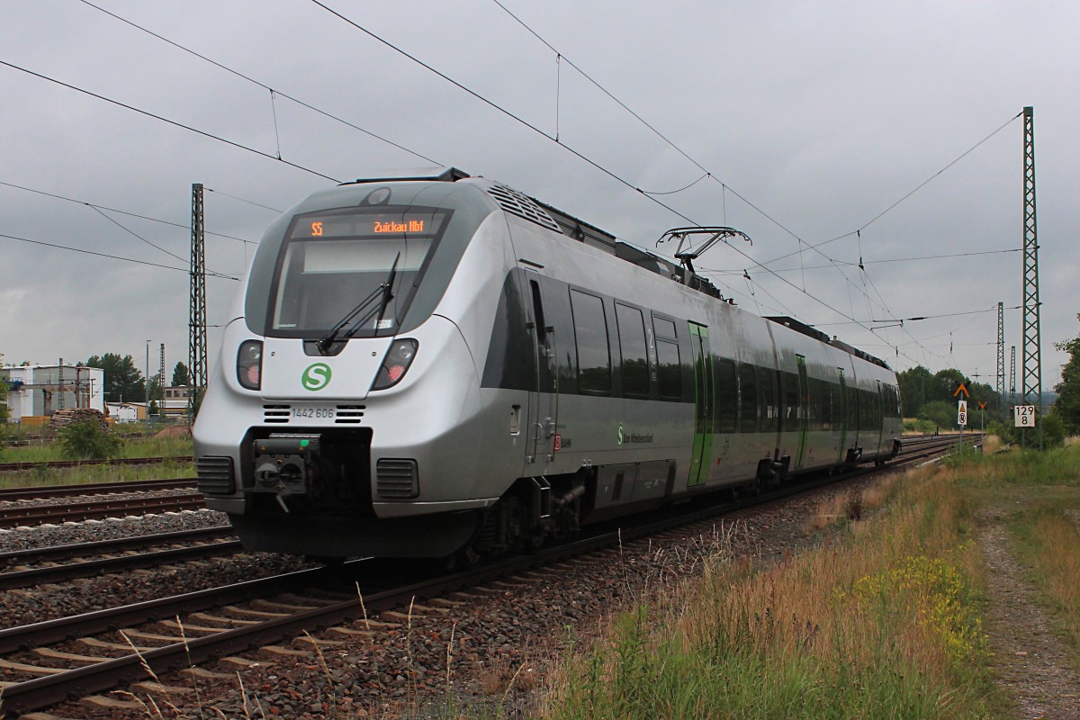 1442 606 fährt am 24.06.2015 als S5 (Leipzig/Halle Flughafen - Zwickau (Sachs) Hbf) über die Olzmannbrücke in Zwickau und wird gleich jenen Endbahnhof erreichen.