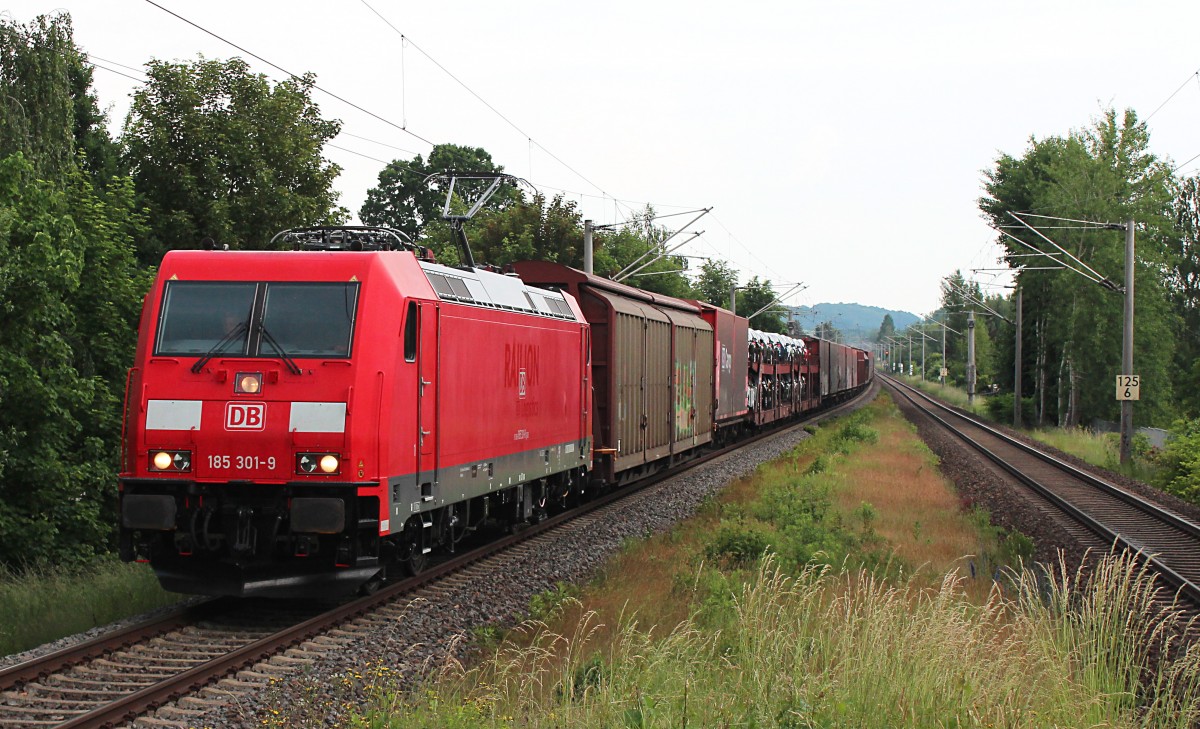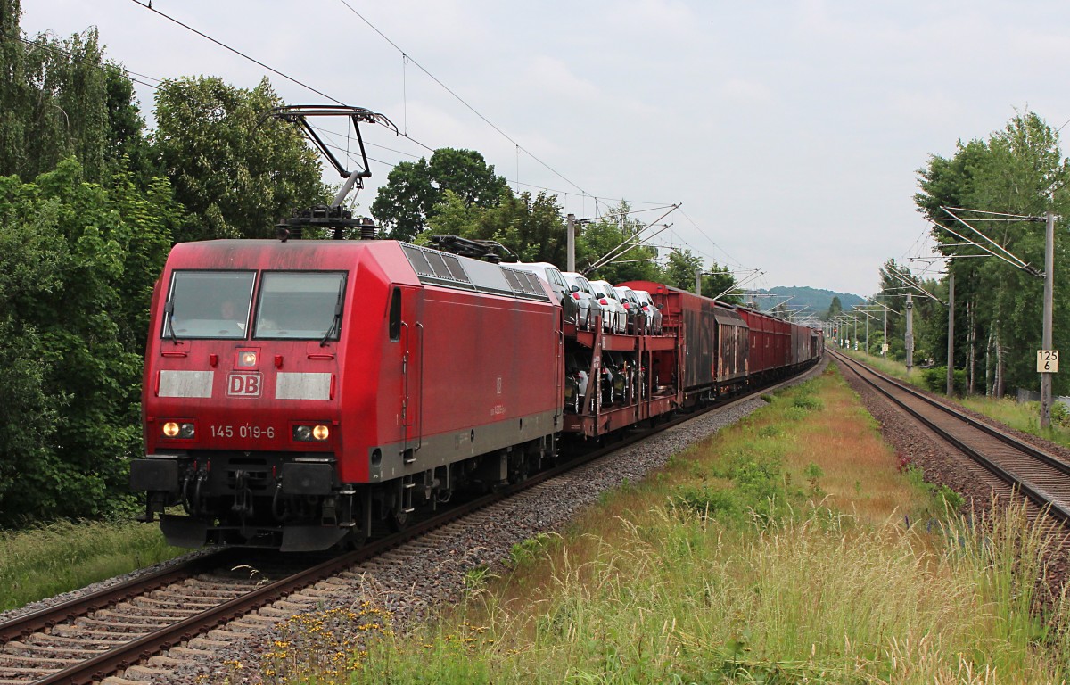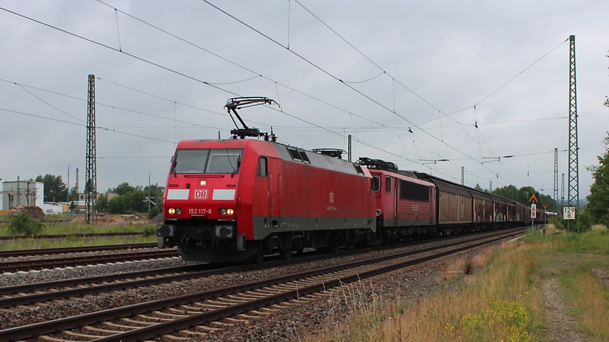 152 117-8 und die kalte 155 065-6 fahren am 24.06.2015 mit dem GA 52804 (Mosel - Braunschweig Rbf) über die Olzmannbrücke in Zwickau.