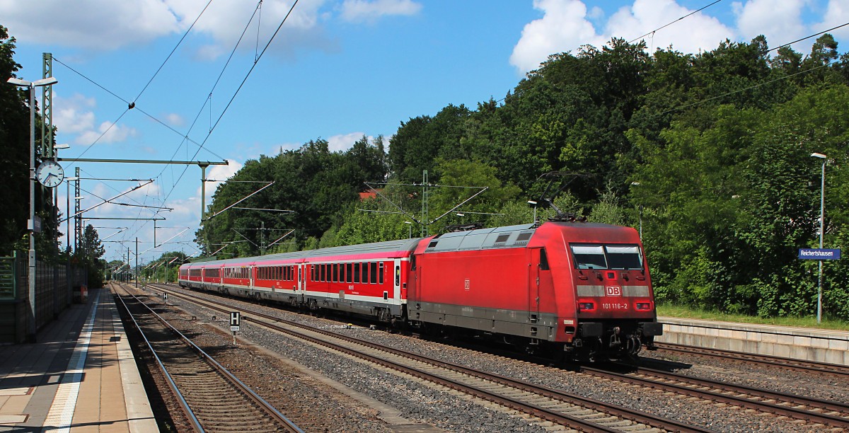 Der  München-Nürnberg-Express  RE 4030 (München Hbf - Nürnberg Hbf) durchfährt am 24.06.2015 Reichertshausen (Ilm), Schublok war die 101 116-2.