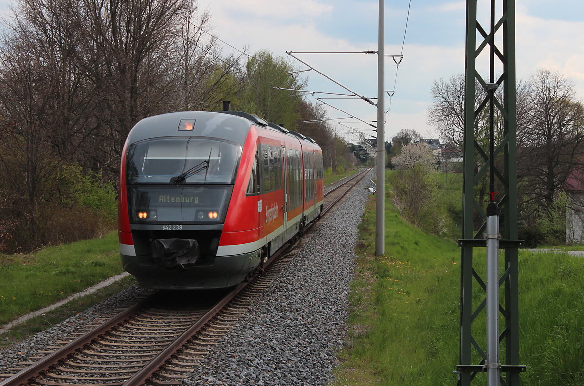612 175 fährt am 30.04.2016 als RE 3909 (Erfurt - Glauchau (Sachs)) durch die Ortslage von Dennheritz.