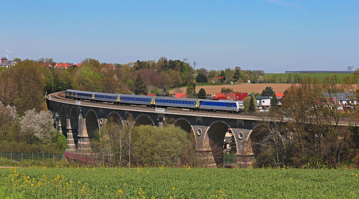 Am 06.05.2016 fährt die MRB74776 (Chemnitz Hbf - Leipzig Hbf) mit einer unbekannten BR 223 über das Bahrebachviadukt in Wittgensdorf. Matthias Hartmann