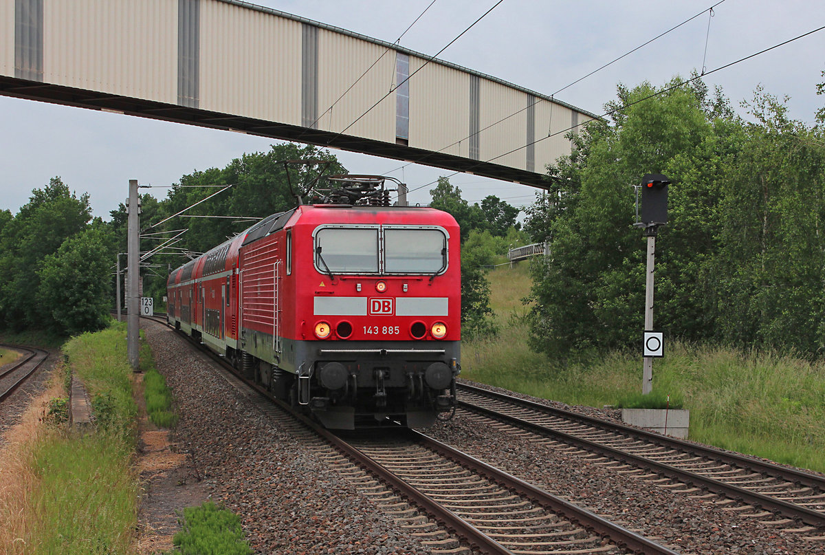 143 885-2 fährt am 11.06.2016 dem mit RE 47623 (Hof Hbf - Dresden Hbf) durch Oberrothenbach.
