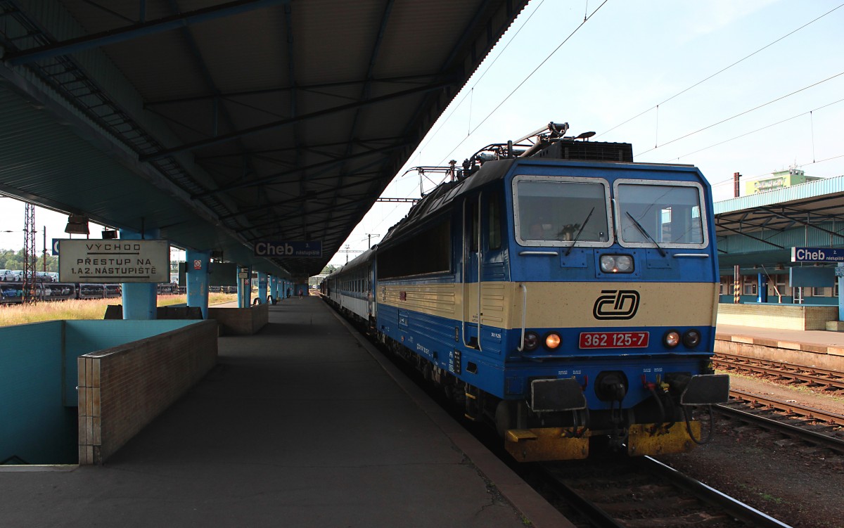 Am 12.07.2015 steht die 362 125-7 mit dem R 609 (Cheb - Praha hl.n.) in Cheb und wartet auf die Abfahrt um 10:18. Der R 609 fährt über Chomutov und Usti nad Labem hl.n. nach Prag. Matthias Hartmann
