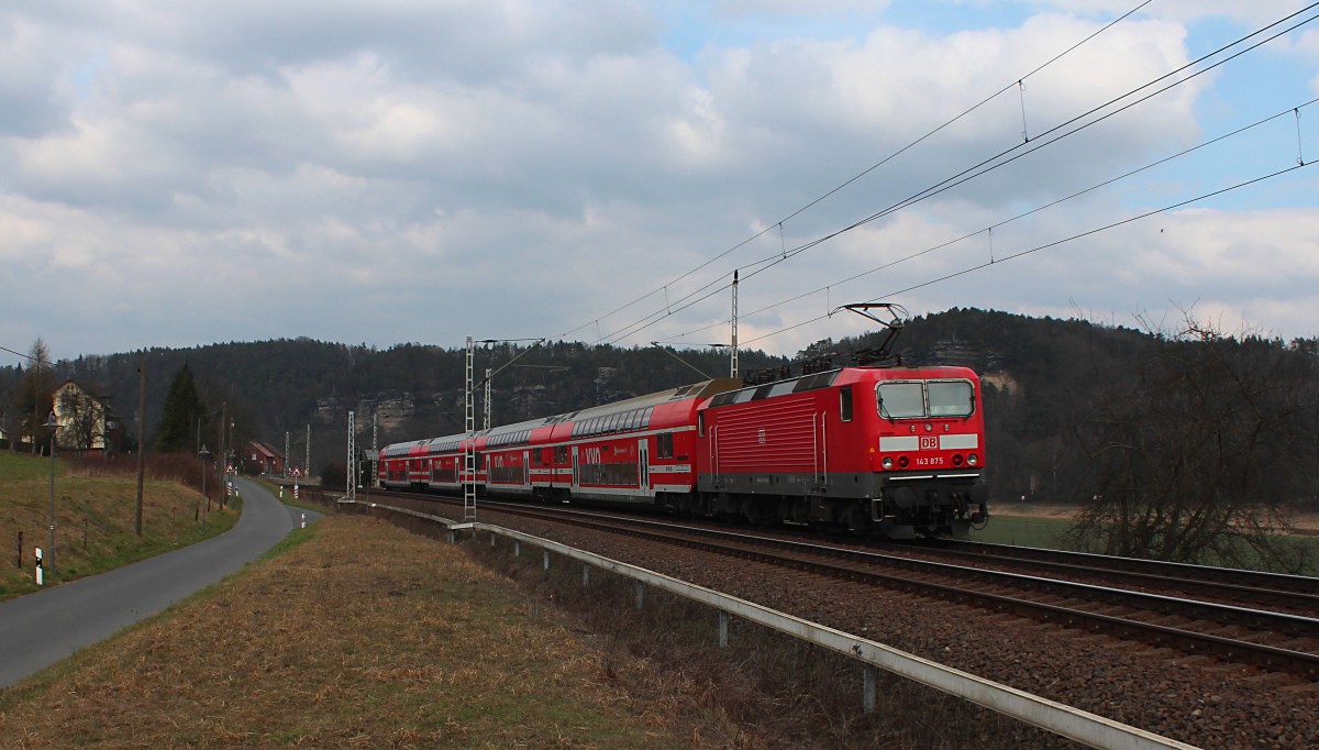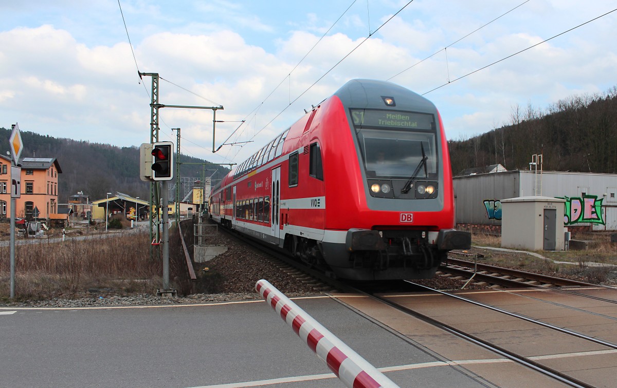 Am 16.03.2015 passiert eine S1 (Schöna - Meißen Triebischtal) der S-Bahn Dresden den Bü in Königstein um in ein paar Minuten gleich den selbigen Bahnhof zu erreichen. Schublok war an jenem Tag die 182 022-4.