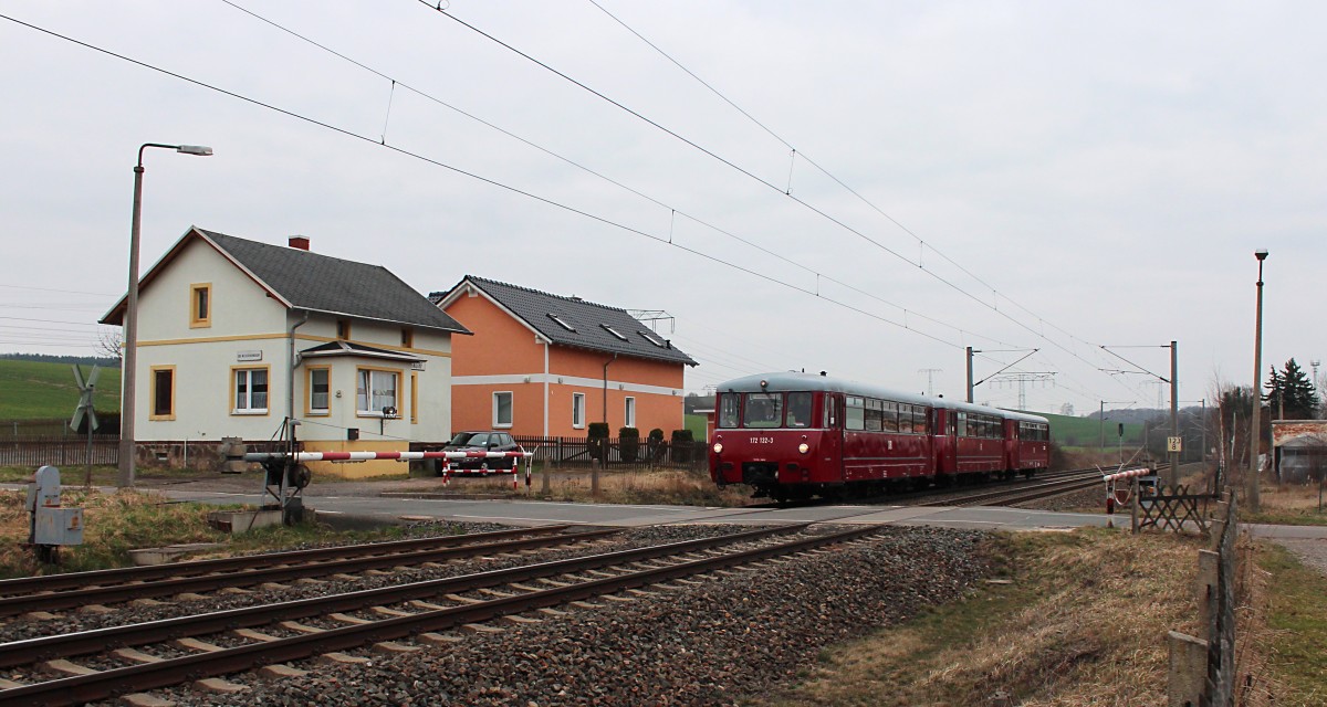 Am 28.03.2015 veranstaltete der Traditionsgemeinschaft Ferkeltaxe e.V. eine Sonderfahrt von Chemnitz über Zwickau und Plauen nach Greiz zum 6. Bierseminar in der Vereinsbrauerei Greiz. Die 172 132-3 + 172 171-1 + 172 760-1 fahren am Block Niederhohndorf vorbei in Richtung Zwickau.