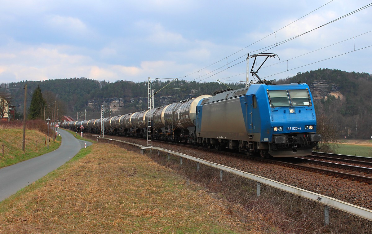Nach einer dreiviertel Stunde folgt am 16.03.2015 die MRCE Dispolok 185 556-8 mit dem nächsten Kesselzug durch den Kurort Rathen in Richtung Bad Schandau, sie fährt aktuell für die CFL Cargo Deutschland GmbH.