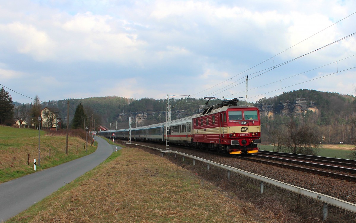 Die 371 004-3 fährt am 16.03.2015 mit den EC 175 (Hamburg Altona - Budapest keleti) durch den Kurort Rathen.