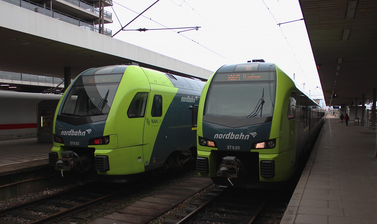 Linkst steht der ET 6.02. (1 430 037) als NBE 83814 nach Wrist und rechts kommt gerade der ET 6.03 (1 430 038) als NBE20767 aus Itzehoe in Hamburg Altona an. 21.03.2015