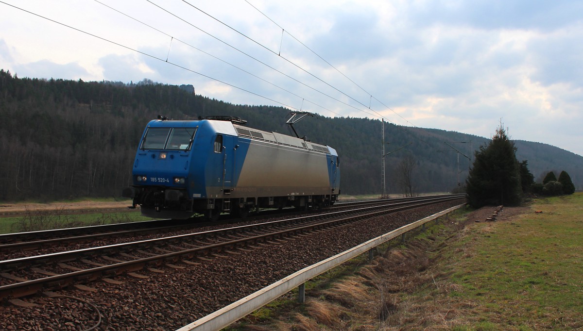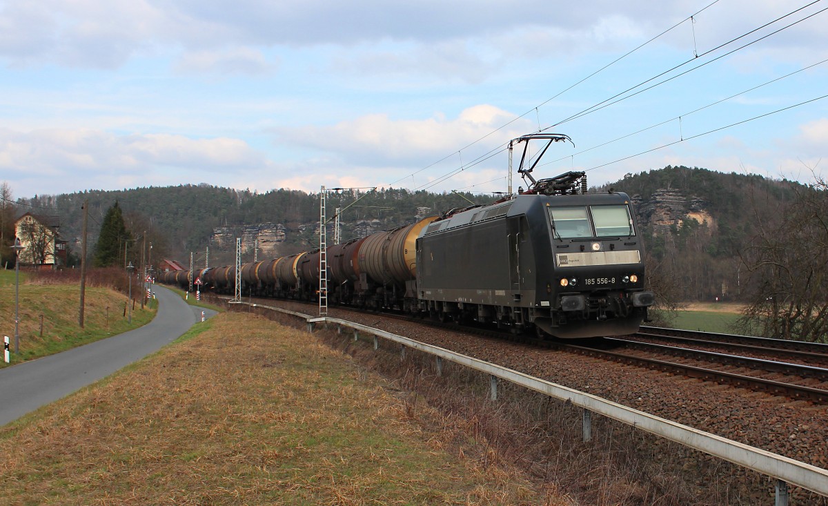 Aufgrund von dem Austausch einer Weiche in Königstein wird zurzeit nur eingleisig gefahren. Hier kommt nach dem durchlassen einem Eurocity und einem Containerzug die MRCE Dispolok 185 556-8 mit ihrem Kesselzug im Gegengleis kurz vor Königstein in Richtung Bad Schandau. Sie fährt zurzeit für die CFL Cargo Deutschland GmbH. 16.03.2015