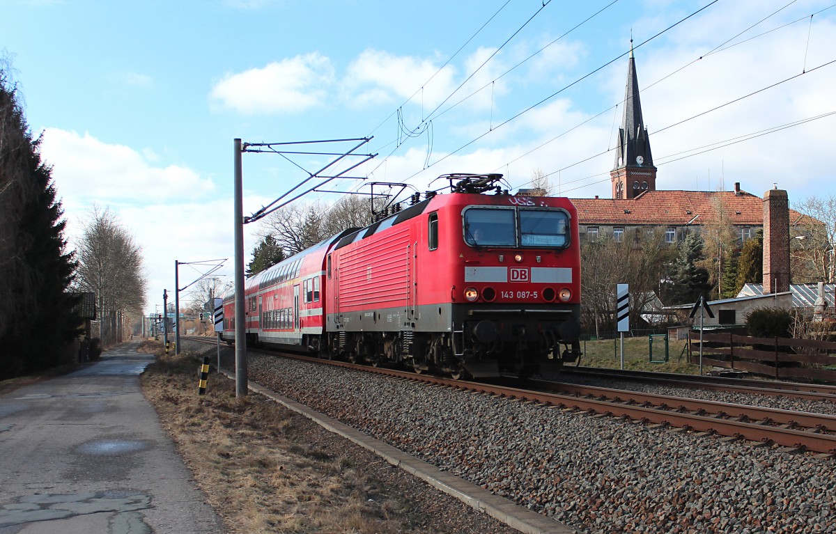 Am 07.03.2015 schiebt die 143 126-1 den RE 4788 (Dresden Hbf - Hof Hbf) durch die Ortschaft Lobsdorf bei St. Egidien, mit der kompletten VVO Garnitur der S-Bahn Dresden. Matthias Hartmann