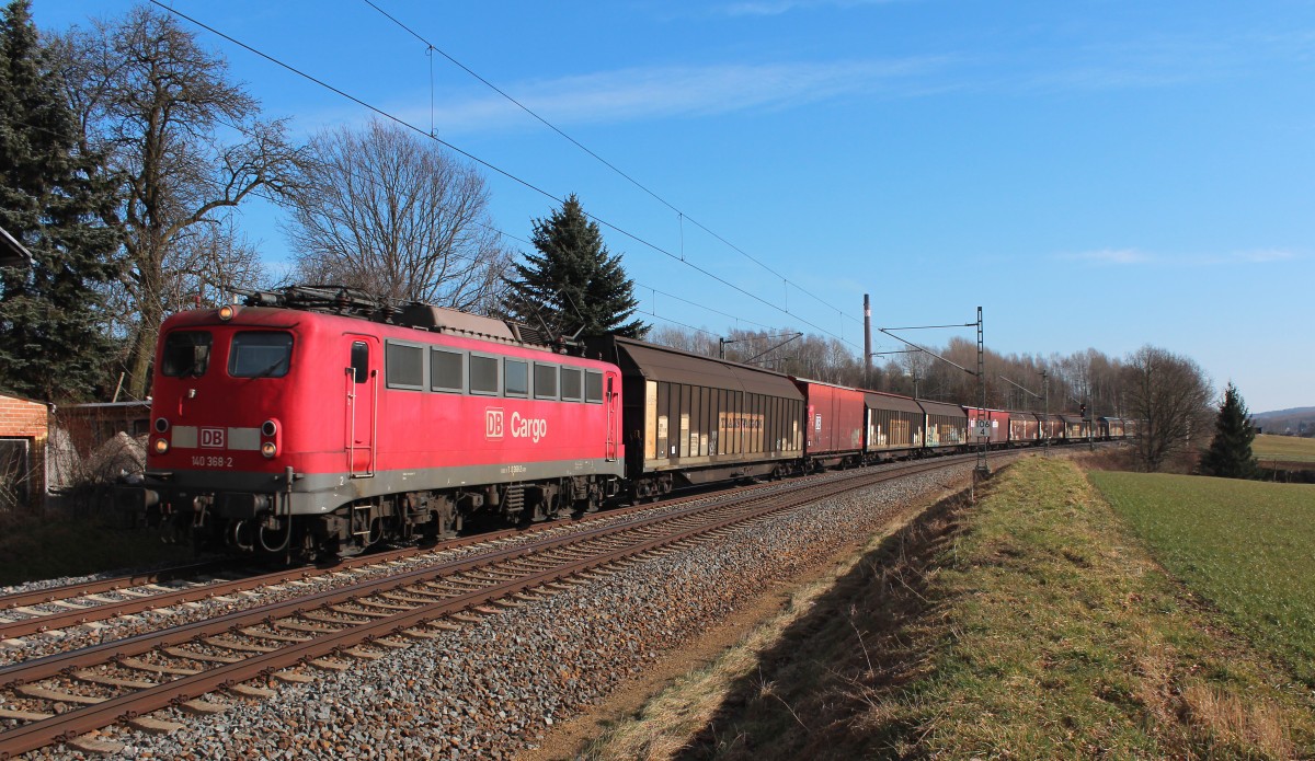 Einer der Umleiter war wieder der GA 52813 (Braunschweig - Mosel), der am 07.03.2015 mit der 140 368-2 nahe der Ortschaft Lobsdorf bei St. Egidien vorbei kam. Matthias Hartmann
