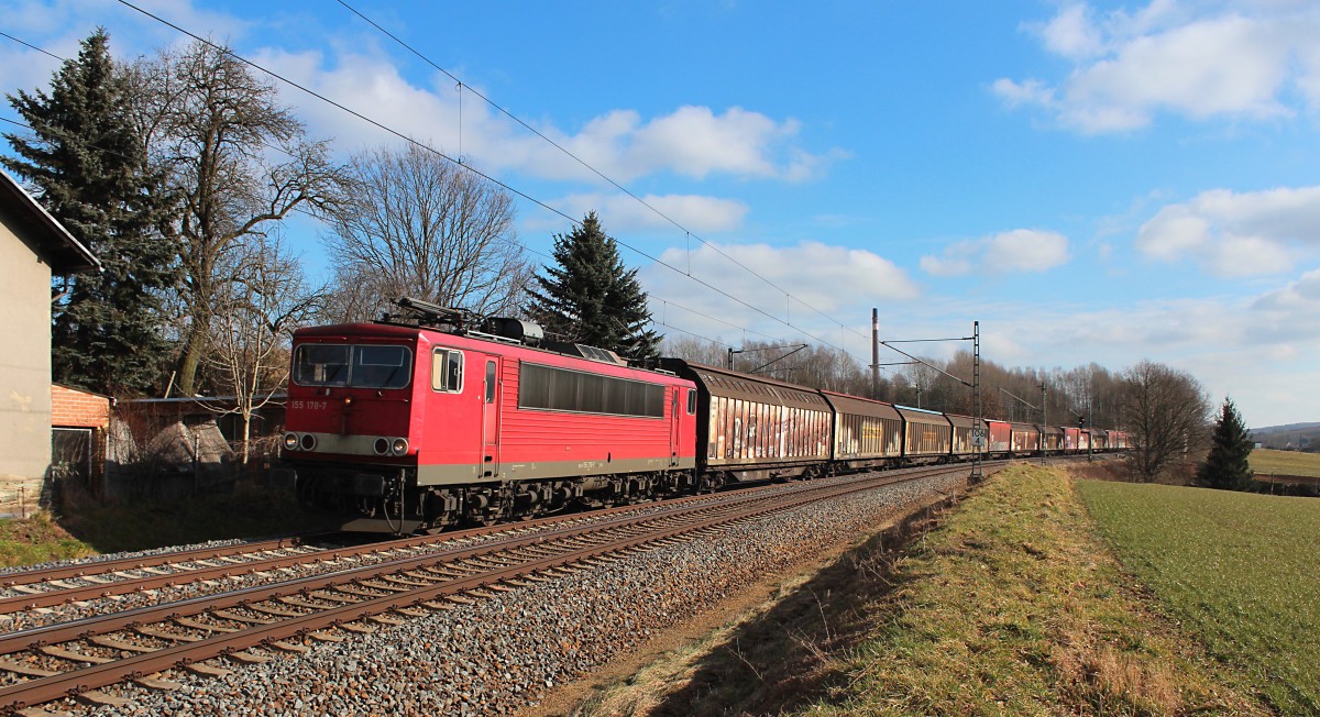 Einer der Umleiterzüge war der GA 52813 (Braunschweig - Mosel) der an jenem Wochenende über Riesa/Chemnitz kam. Hier fährt die 155 178-7 am 28.02.2015 mit dem GA 52813 durch die Ortslage von Lobsdorf. Matthias Hartmann