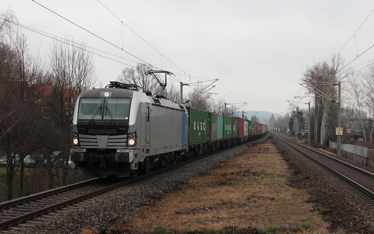 Von der Umleitung betroffen war auch der DGS 88941 (Hamburg - Wiesau), der an diesem Wochenende zur Mittagszeit durch Zwickau kam nicht schon 08:30 wie letzte Woche. 193 804-2 fährt am 14.03.2015 mit ihrem Containerzug durch Zwickau-Pölbitz. Matthias Hartmann
