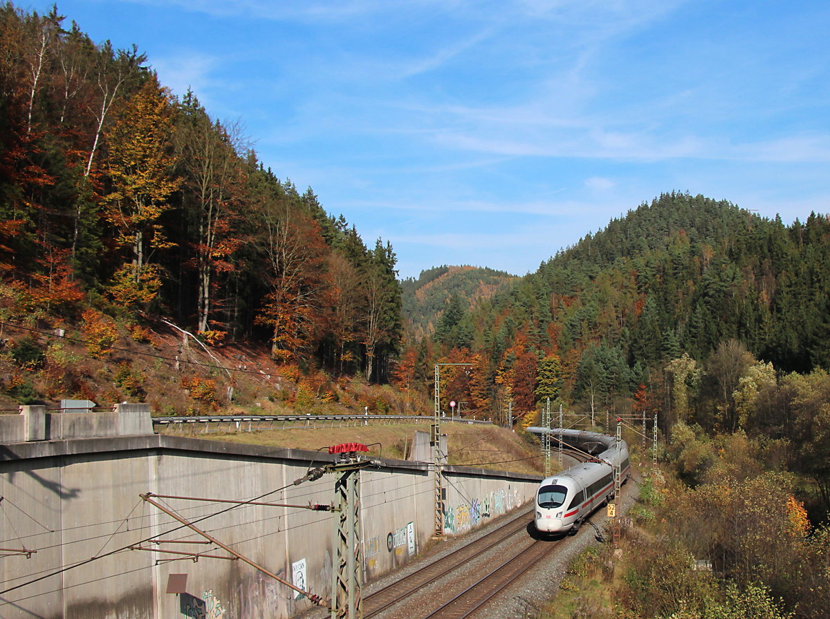 ICE 1610 (München Hbf - Hamburg Altona) durchfährt am 18.10.2017 Lauenstein den herbstlichen Frankenwald hinunter.