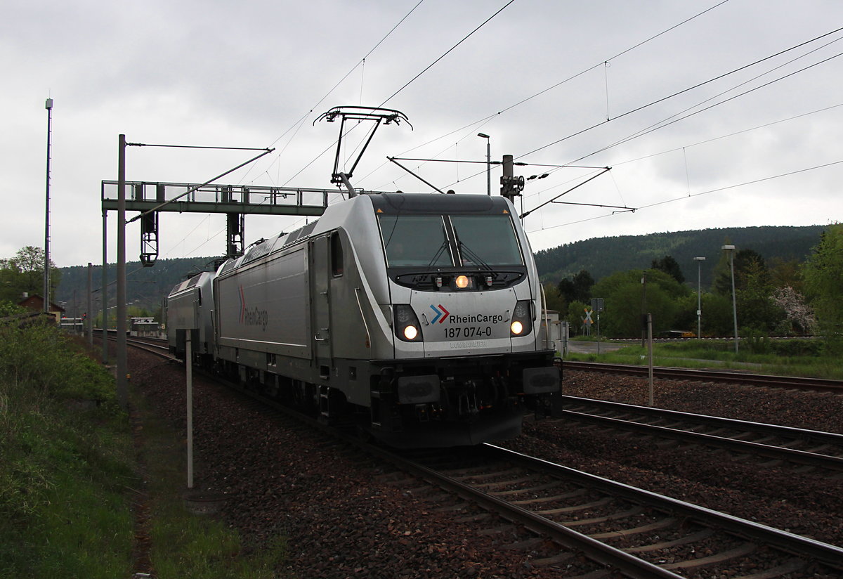 187 074-0 beschleunigt mit der 145 084-0 von der Rheincargo am 05.05.2017 aus Orlamünde.