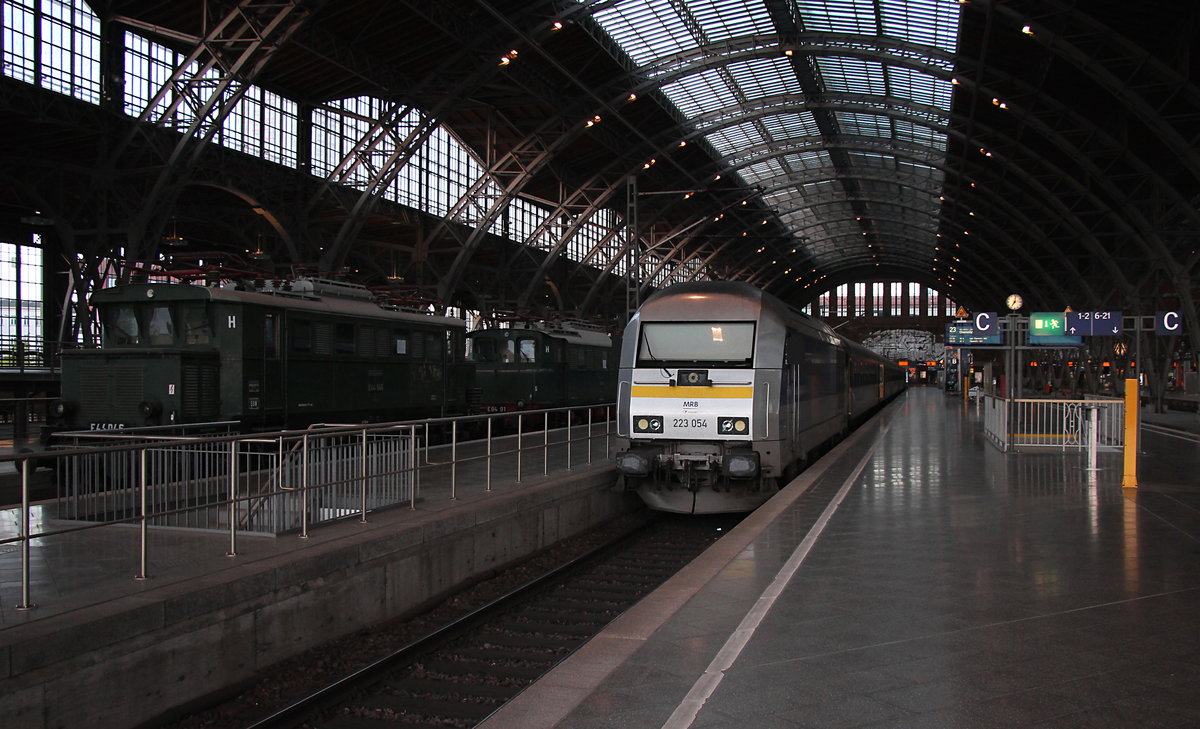 223 054-8 von der MRB steht am 16.04.2017 mit dem RE 81284 (Leipzig Hbf - Chemnitz Hbf) in Leipzig. Nebenan auf dem Museumsgleis steht die E44 046