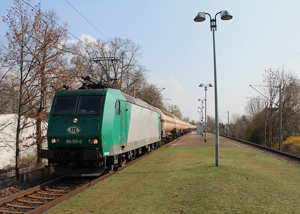 185 517-0 fährt am 02.04.2014 mit einem Kesselzug aus Nürnberg nach Bad Schandau durch Zwickau-Pölbitz, am Zugende hängt noch eine MaK 1000BB (271 014-3). Matthias Hartmann