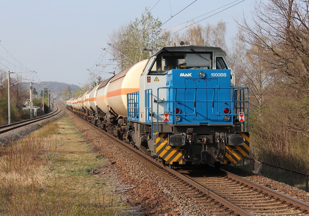 Nachschuß auf die MaK 1000BB (271 014-3) die am Zugende des Kesselzuges von Nürnberg nach Bad Schandau hängt, bei der Durchfahrt in Zwickau-Pölbitz. 02.05.2014 Matthias Hartmann