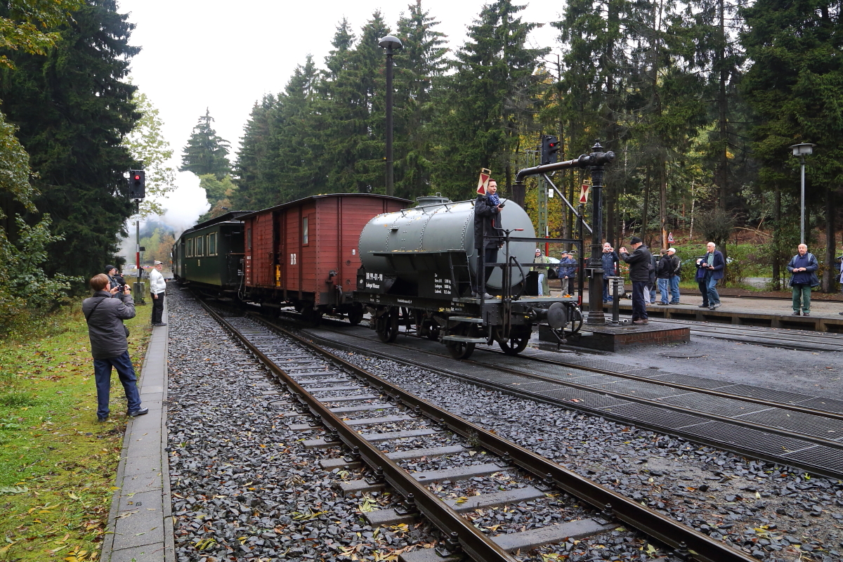 Nachdem 99 5901 am Vormittag des 17.10.2015 ihren IG HSB-Sonderzug im Bahnhof Drei Annen Hohne von Gleis 1 auf Gleis 2 umgesetzt hat, steht jetzt das Wasserfassen an, bevor die Fahrt in Richtung Nordhausen Nord fortgesetzt wird.