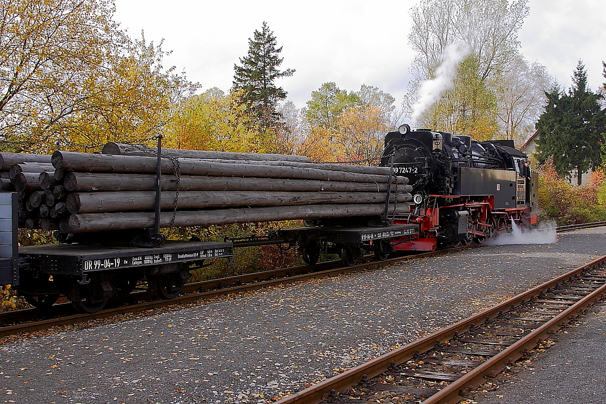Nachdem der Vorgang des Wasserfassens abgeschlossen ist, ein kurzer Pfiff und 99 7247 setzt sich am 20.10.2013 im Bahnhof  Eisfelder Talmühle  in Bewegung, um ans andere Ende Ihres Sonder-PmG der IG HSB umzusetzen. Danach wird der Zug auf`s Nachbargleis rangiert, um Gleis 1 für einen Planzug aus Drei Annen Hohne freizumachen. Beleuchtet wird die Szene von den letzten Strahlen der Sonne, welche sich hier erstaunlicherweise noch einmal kurz zeigte, bevor sie endgültig hinter dicken Regenwolken verschwand.