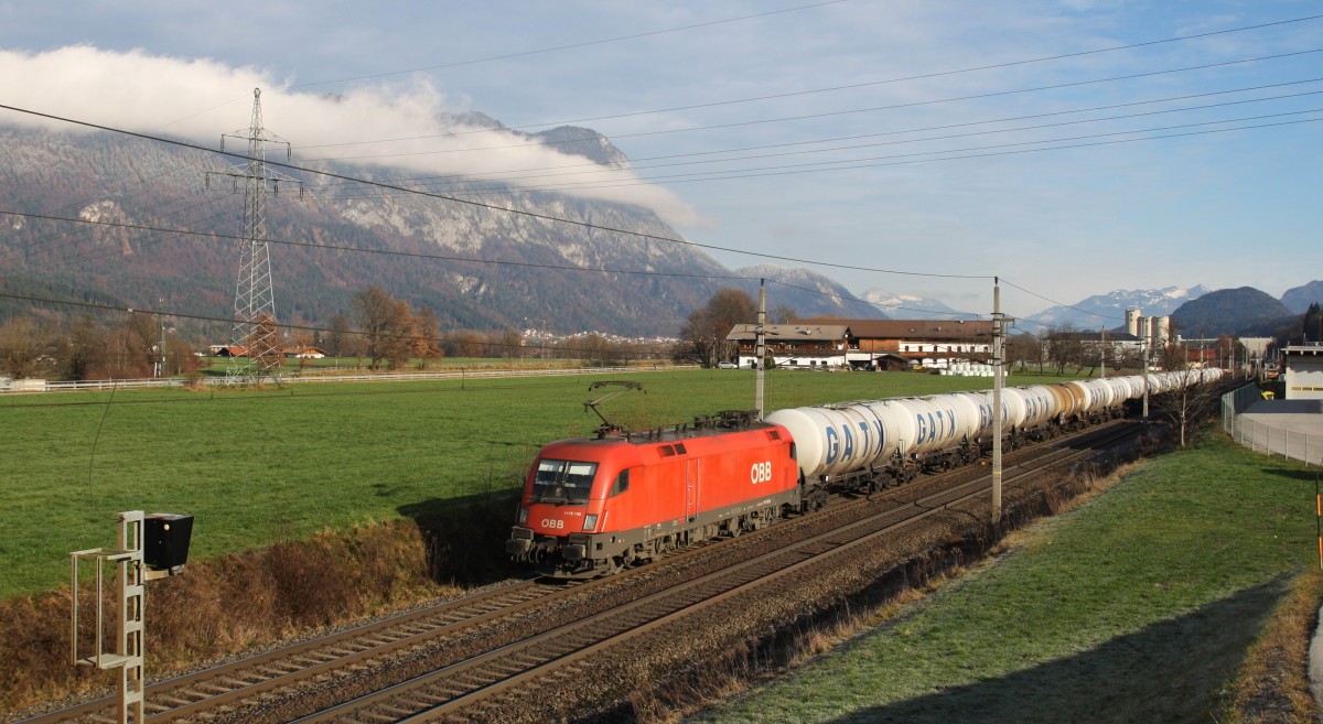 1116 136-3 der ÖBB ist am 10.12.2014 mit einem Kesselzug von GATX durch das Unterinntal unterwegs. Hier bei Kirchbichl, kurz vor Wörgl. Julien Seeling