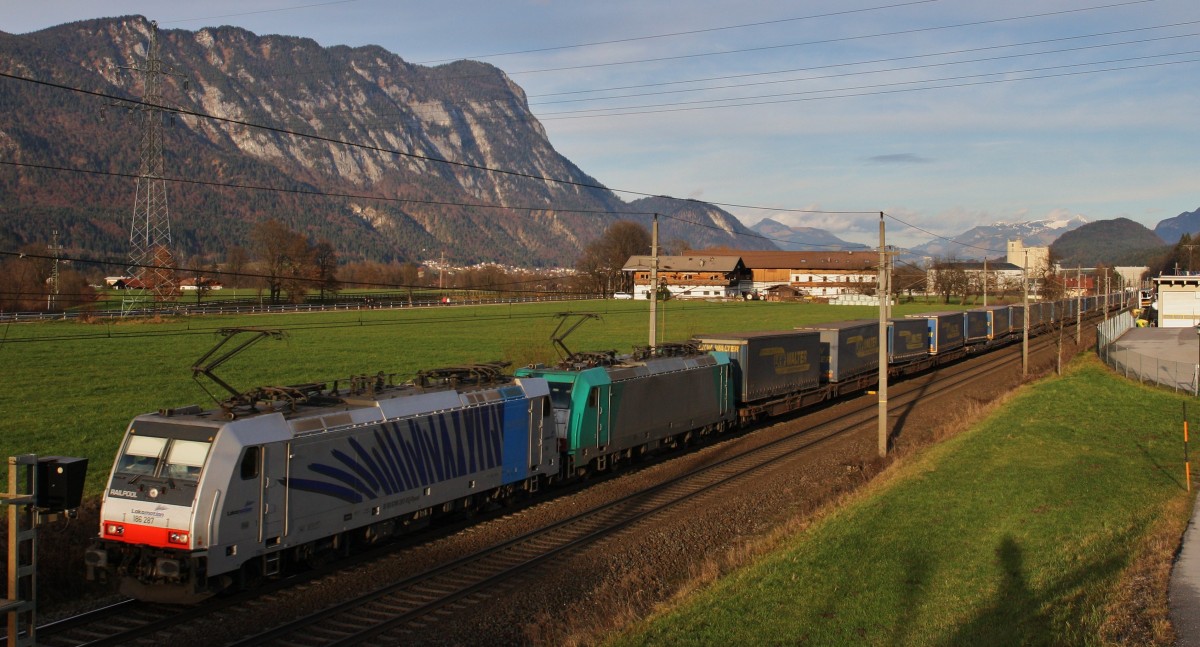 186 287-8 und 186 247-3 von Lokomotion ziehen den LKW-Walter Zug am 21.12.2014 durch das Tiroler Unterland Richtung Italien. Hier bei Kirchbichl. Julien Seeling