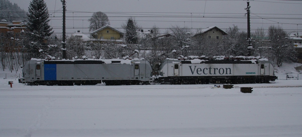 Die 2 neuen Zebras 186 441-2 und 186 444-6 von Lokomotion stehen am Abend des 6.1.2015 im Bahnhof Kufstein. Die Zulassung für Österreich und Italien fehlen noch. Die Loks von Lokomotion sehen immer super aus :-) Julien Seeling